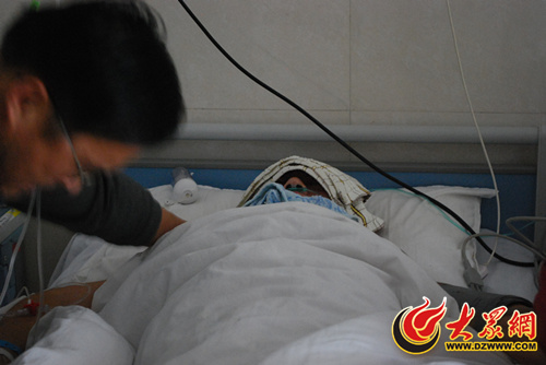 龚钰犇躺在北边的病床上,全身都盖着被子,头上敷着毛巾,露出的左脚裹着厚厚的纱布。病床边挂着八九袋点滴,鼻子里还插着氧气管。他已经清醒,嘴里咬着毛巾,仍时不时的发出疼痛的呻吟声。