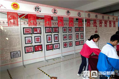 莱州市过西中学”纸上开花剪纸工作坊“的展览作品全部出自学生巧手,内容包括爱国爱党、红色文化、向党旗敬礼、抗击疫情、花卉纹样、美好生活……一幅幅鲜红、精致的作品无不展示出中国共产党带领中国人民不懈奋斗的光辉历程。
