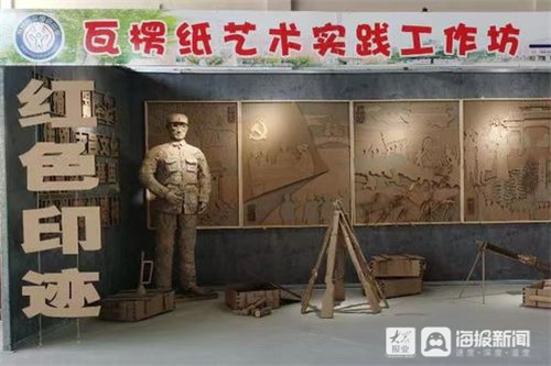 莱州市神堂中学“红色印迹”艺术实践工作坊——以地道战为主题,以纸塑为呈现方式,将雕塑、书法、山东快板融入工作坊,配以门楼、土墙、石磨、石碌碡以及各式武器和农具等,构成了一个军民一家亲的农家小院场景。