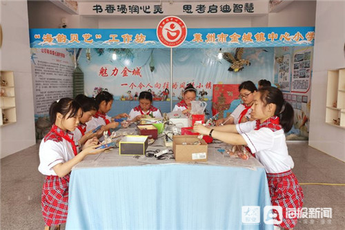 莱州市金城镇中心小学“海韵贝艺”工作坊——以家乡的蓝天碧海为背景,通过精美的贝类作品展示魅力金城的美景与丰富的物产,歌颂在中国共产党的领导下新农村人民的幸福生活,展现出学校少先队员积极向上的精神风貌。