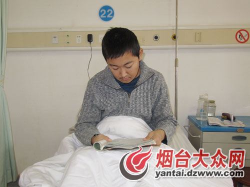 11月25日上午,烟台大众网记者来到毓璜顶医院8楼泌尿外科22床时,周春江脸色苍白,说话有气无力,但手里还拿着高中课本依然在学习着。