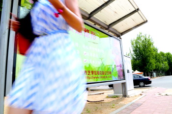 进入暑假,烟台大学西门门口的公交站点广告牌上,打出了整形的广告。 本报记者 韩逸 摄