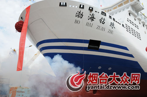 大众网烟台9月12日讯 (通讯员 王建波 记者 王瑜) 9月12日上午10时58分,随着象征吉祥如意的香槟酒的开启,渤海轮渡股份有限公司斥资近4亿元建造的亚洲最大最豪华客滚船—“渤海钻珠”轮,在黄海造船有限公司船厂顺利下水。下水后,经过4个多月的内部装修,预计于2015年2月前后投入运营。其姊妹船“渤海玛珠”轮也将于2014年11月份下水。