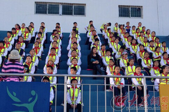 南通路小学学生穿着荧光衣参与烟台市芝罘区中小学田径运动会