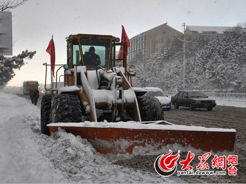 大众网烟台12月16日讯 (记者 钟建 摄影 容德宇)烟台市气象台16日6时30分发布道路结冰橙色、暴雪蓝色预警信号,并继续发布大风黄色预警信号:受较强冷空气影响,昨天夜间开始,烟台北部地区出现4毫米以上明显降雪,气温较低,道路有积雪和结冰,对交通有较大影响。预计今天白天到夜间,北部地区仍有小到中雪,其他地区小雪,西北风,风力较大。请注意防风、防冻、防滑。
