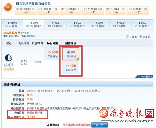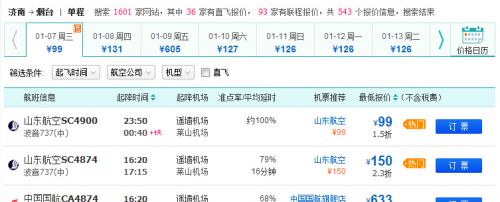 记者发现,目前,烟台往返济南的单程票价均已降低,早6:40的烟台飞济南,最低机票99元,再加上基建50元和燃油费10元,总价156元!
