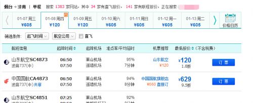 J舱最价格120元,总价180元。济南飞烟台机票价也仅180元!