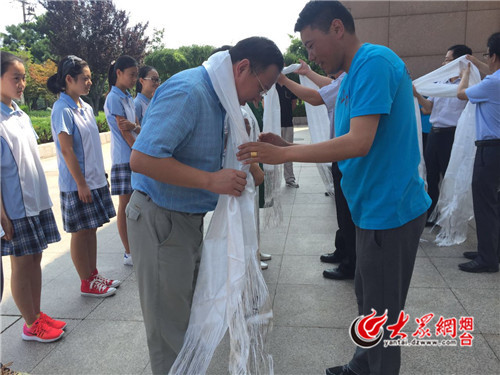 在巴顿和拉巴仓决两位带队老师的带领下,“格桑花”们按照藏族同胞的最高礼节,向烟台二中的老师、新结交的10名小伙伴以及其他朋友敬献了洁白的哈达。来自高原的圣洁礼物,让现场的人们惊喜不已。“希望孩子们在几天的交流中相互学习、相互促进、相互激励,并将自己的感悟分享给身边的同学。”烟台二中副校长刘军荣说。