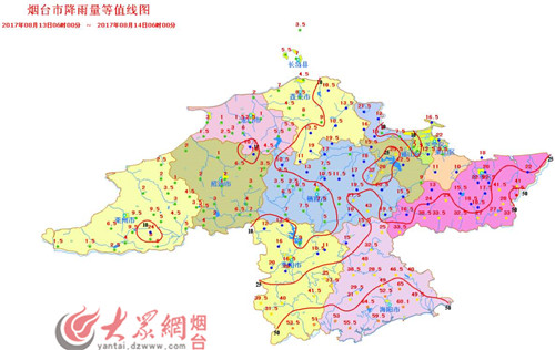 大众网烟台8月14日讯 (通讯员 姜会杰 记者 杨瑞远) 受气旋影响,8月13日6时至14日6时,烟台市普降小到中雨,局部大到暴雨。据烟台市水文局统计,本次降水全市平均降水量16.9毫米,平均降水量最大的为昆嵛区46.7毫米。