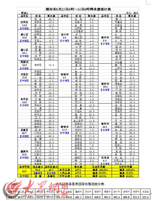 今年以来各县市区平均降水量分别为:芝罘区403.2毫米,莱山区451.7毫米,福山区458.4毫米,高新区420.8毫米,开发区437.5毫米,牟平区498.1毫米,昆嵛区600.8毫米,蓬莱市482.2毫米,龙口市520.0毫米,招远市618.0毫米,栖霞市592.3毫米,莱州市491.4毫米,莱阳市590.8毫米,海阳市522.3毫米,长岛县322.4毫米。