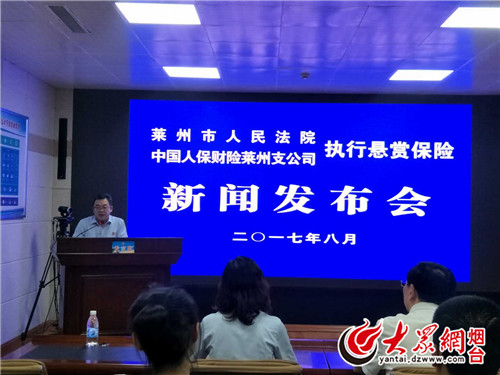 8月29日,在莱州法院“执行悬赏保险”制度新闻发布会上,莱州法院副院长高素琴与中国人保财险莱州支公司经理于志勇就该制度的推进落实签署协作备忘录,执行局局长朱维升介绍了“执行悬赏保险制度”出台背景及期望达到的效果,中国人保财险莱州支公司经理于志勇对“执行无忧”悬赏保险制度内容作具体说明。