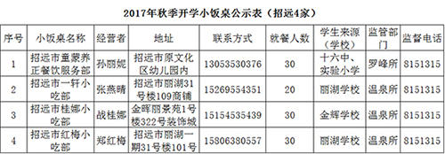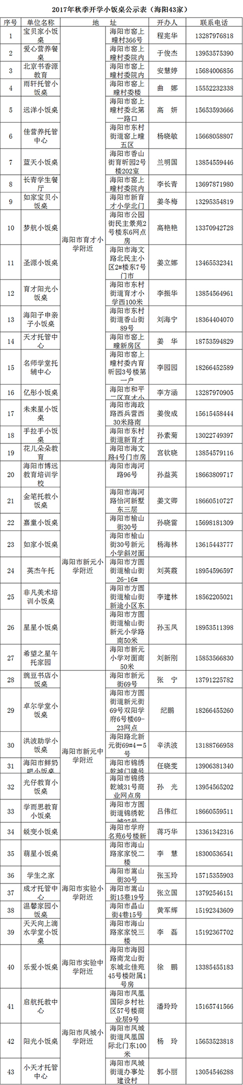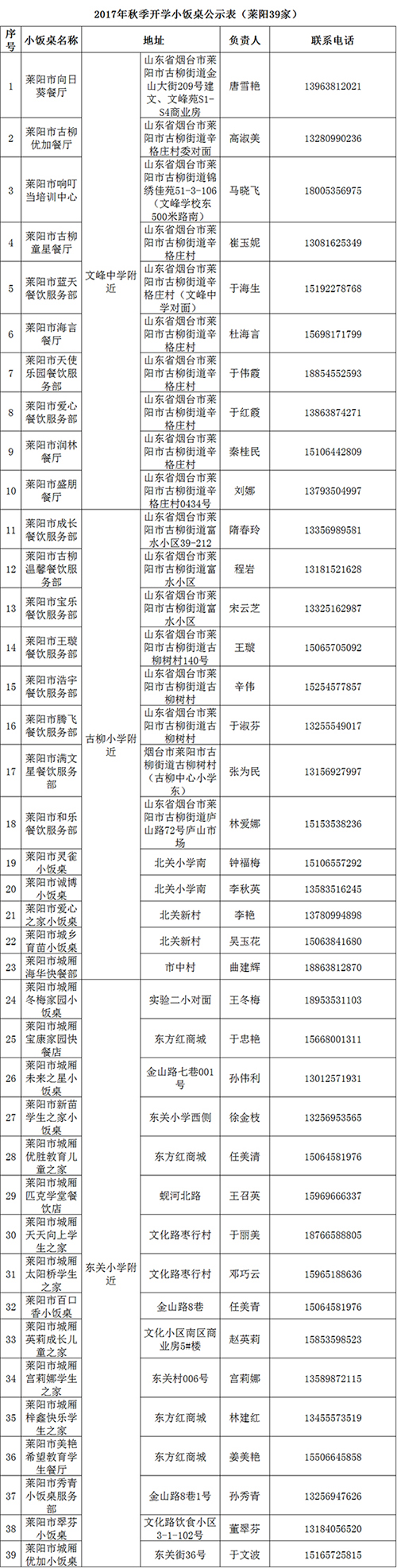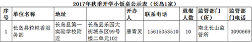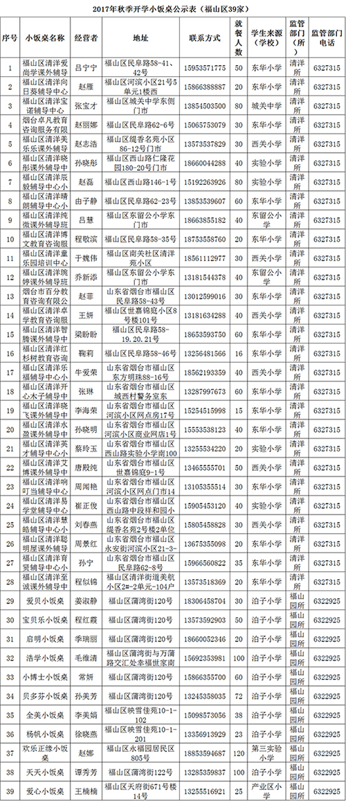 大众网烟台9月4日讯 (通讯员 夏天棋 记者 李林) 为进一步规范烟台市校外学生“小饭桌”整体经营秩序,结合省局和省教育厅联合下发的《关于开展学校食堂食品安全大培训大检查大整改大提升的通知》(鲁食药监发〔2017〕43号)要求,在秋季开学之际,烟台市食品药品监督管理局对全市“小饭桌”经营情况进行了大排查,现将烟台市565家“小饭桌”登记备案情况予以公示。如果学生家长发现或得知小朋友反映“小饮桌”存在经营不规范或存在相关食品安全隐患问题的,请拨打12331电话进行投诉举报,烟台市食品药品监督管理局将第一时间赶赴现场对反映情况进行调查处置。