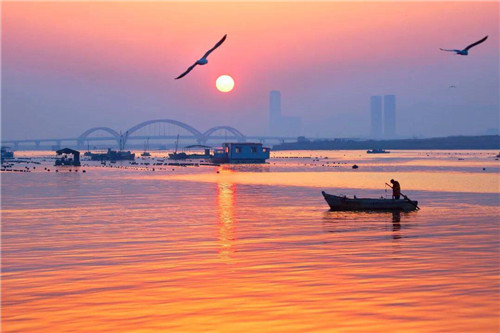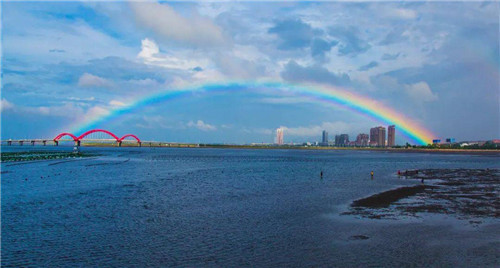 养马岛大桥在缤纷色彩的映衬下更加鲜艳