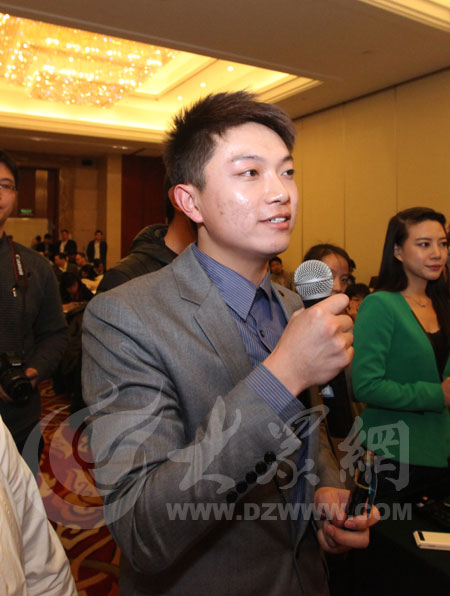 大众网特派记者就大众网网友提出的问题现场向十二届全国人大代表、烟台市委副书记、市长王良提问。(大众网特派记者 赫洋 摄)
