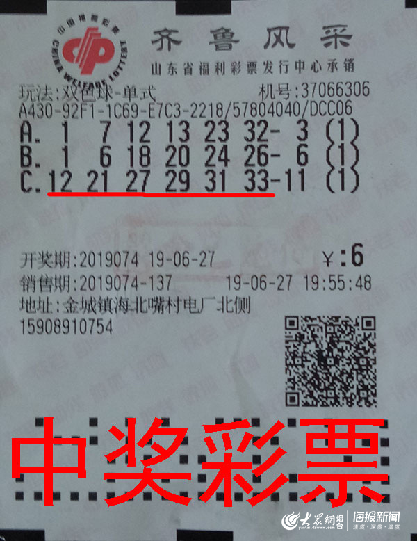 大众网·海报新闻烟台7月8日讯 (记者 李林) 6月27日晚,中国福利彩票双色球第2019074期开奖,莱州第37066306投注站的一位彩友,凭借自选单式的投注方式幸运中得1注双色球二等奖,揽获55.87万元。7月1日,幸运彩友邹先生(化姓)来到了烟台市福彩中心,领走了他中得的55.87万元奖金。
