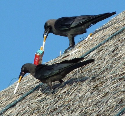 乌鸦与同伴从烟盒中叼出香烟细细“品味”