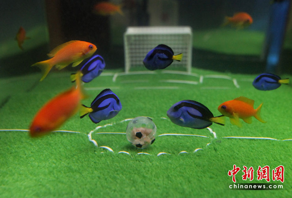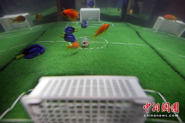日本横滨:鱼儿组队进行水中世界杯足球赛