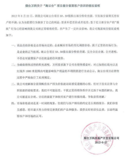 8月23日,烟台万科海云台与搜房网推出“礼献港城闪购活动”,打出了“6280元/㎡起”的宣传广告,和之前8500元/㎡的售价相比,下降了26%左右。这一消息,引起了前期购买业主的抗议。