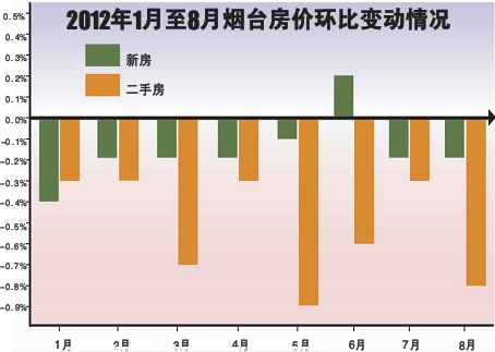 9月18日,国家统计局发布了2012年8月份70个大中城市住宅销售价格变动情况。数据显示,全国70个大中城市中环比下降的有20个,持平的有14个,上涨的有36个。烟台市房价“两连跌”,继7月份下降0.2%之后,新房价格环比再下降0.2%。二手房方面,烟台环比下降了0.8%,同比下降幅度达到了4.7%,而二手房中的大户型同比降幅高达6.5%。业内人士表示,在高库存和政策压力之下,今年的“金九银十”或难以再现。