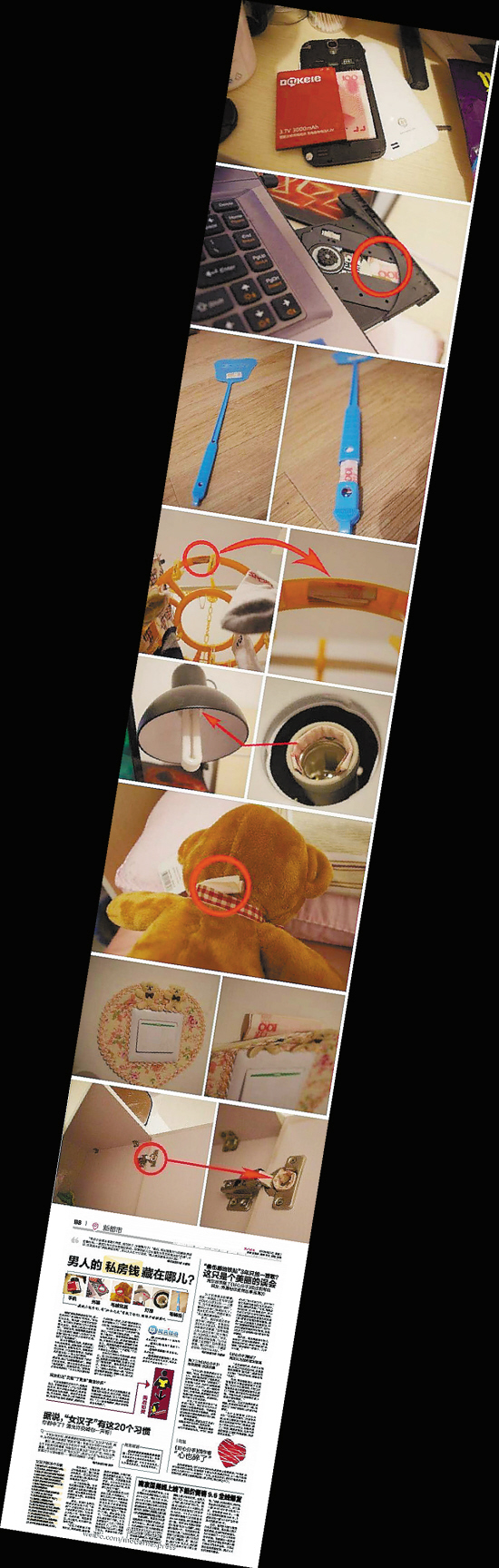 最近,网友整理出15处藏私房钱的最佳地,一度成为各大论坛转载的热点。这15个藏钱处包括:电脑光驱、手机电池背后、衣架底部、灯泡接口处、烟盒里、衣橱合页内、苍蝇拍的空心手柄、开关装饰物背后、毛绒玩具的围巾里……令人大开眼界。