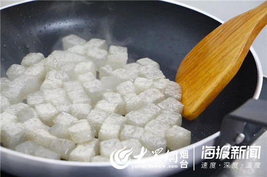 6、不粘锅加入10克花生油烧热,倒入焖子煎到色泽由白变透明。