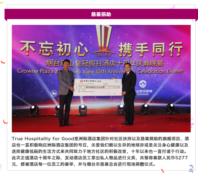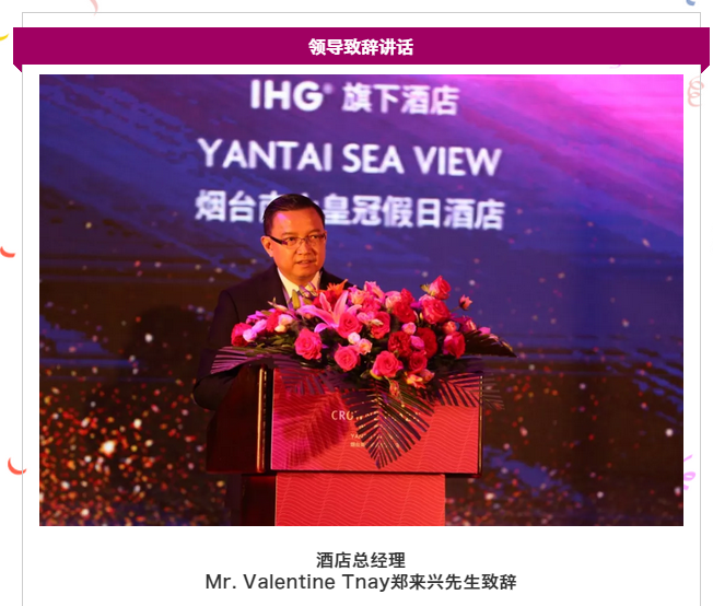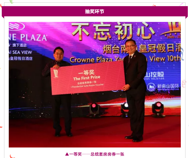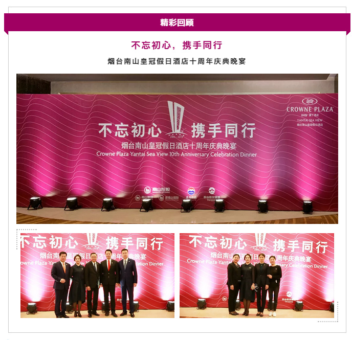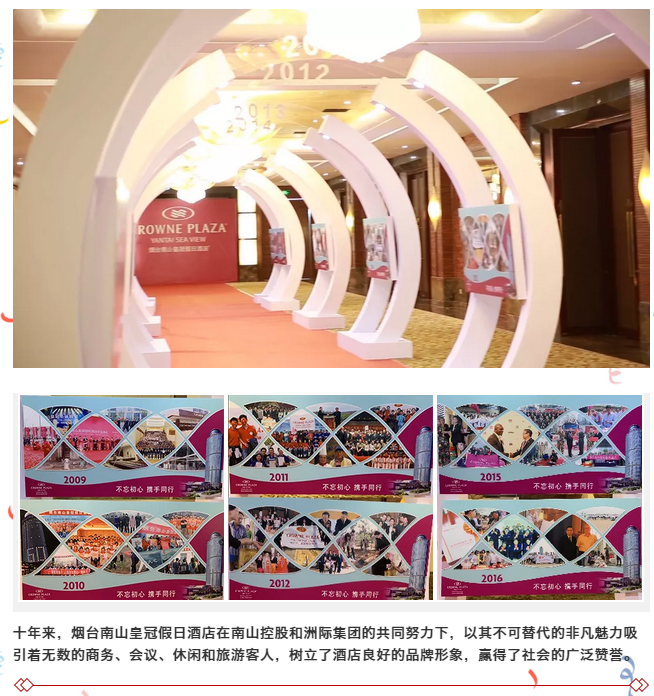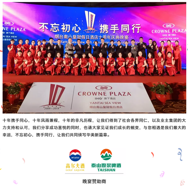 大众网·海报新闻烟台5月20日讯 2019年5月15日下午17:30,烟台南山皇冠假日酒店于酒店二楼红宝石宴会厅举行十周年庆典。现场邀请了酒店业主公司--南山酒店管理公司总经理战世旺先生,酒店管理公司--洲际酒店集团北区运营副总裁Mr. Joseph Wong先生到场并致辞,及社会各界同仁,客户代表,媒体朋友们共同庆祝这一历史时刻。