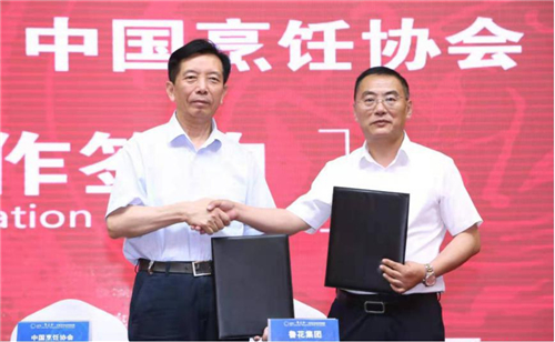 中国烹饪协会会长姜俊贤和鲁花集团副总裁程刚代表双方进行战略合作签约