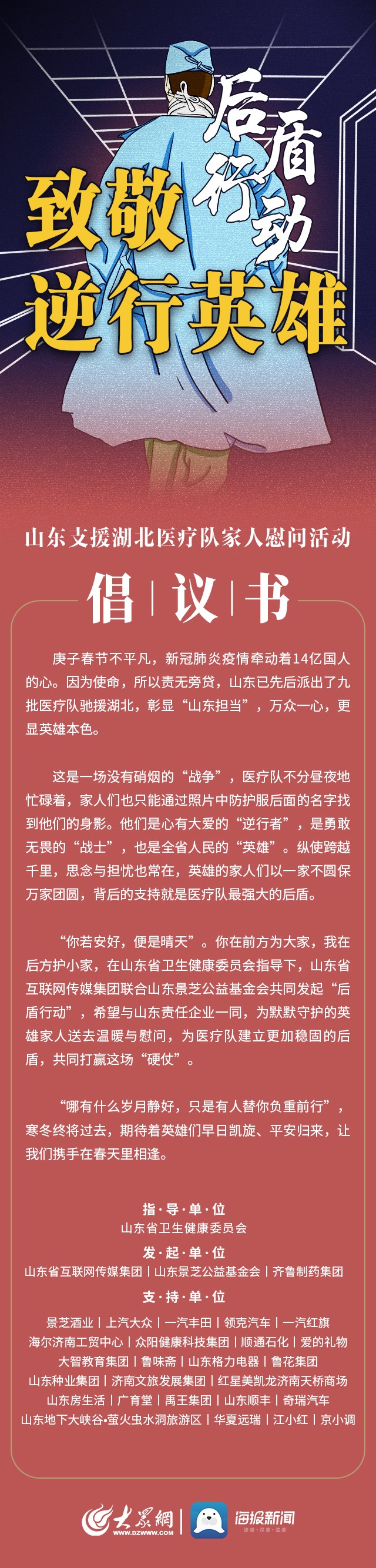 截至目前,山东省已向湖北省派出九批医疗队。近日,在山东省卫生健康委员会指导下,山东省互联网传媒集团与山东景芝公益基金会、齐鲁制药集团联合倡议,发起了“致敬逆行英雄后盾行动——山东支援湖北医疗队家人慰问活动”。