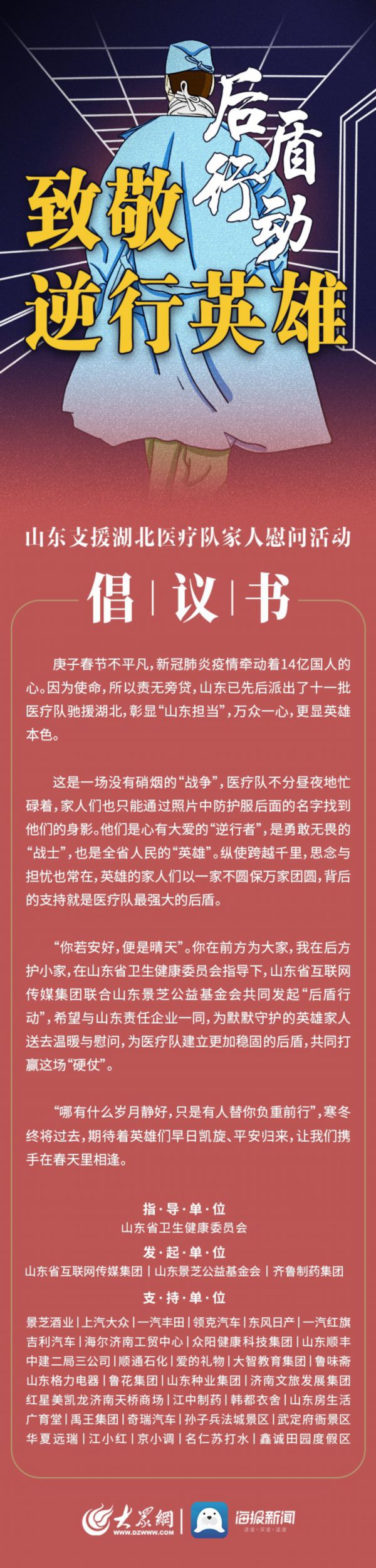 为让前方医护队员们无后顾之忧,让他们的家人感受更多的社会关爱,在山东省卫生健康委员会指导下,山东省互联网传媒集团与山东景芝公益基金会、齐鲁制药集团联合向山东责任企业发出倡议,发起“致敬逆行英雄后盾行动——山东支援湖北医疗队家人慰问活动”。目前,活动已获得30多家爱心企业的支持。