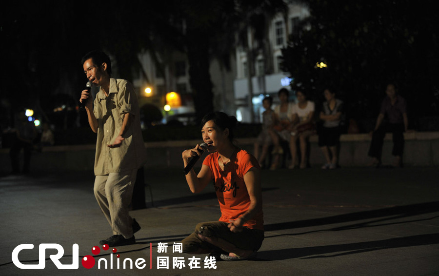 国际在线报道:2012年9月23日晚8点多,在广东中山三乡文化广场一角,上百名观众站着围成一个圈,静静地听着歌。唱到精彩处,大家热烈鼓掌,不少人掏出钱包,开始往红色的募捐箱内塞钱。人群中央,一名身着红色上衣的年轻女子端坐在地上满脸笑容,边唱歌边随着音乐节奏舞动着自己的上身。借着灯光,有路人发现,女子的双手残疾,话筒只能靠手腕夹着;而她的双脚满是伤痕,就连肌肉和骨骼也已扭曲变形。看到这,有人转开了眼睛。但女子没有停下来,在《自由飞翔》歌曲的伴奏乐中,依然满脸笑容,不时还艰难地挪动自己的身体,面朝四方的观众挥手致意。在女子的身旁,一名个子不高、驼背的中年男子,正与她对唱着。深情之时,两人手拉手,相视对唱引得阵阵掌声。