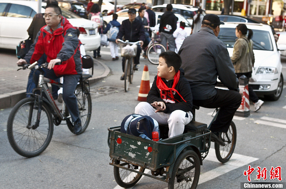 10月22日,北京中关村一所小学放学后,一位家长骑着三轮车带孩子回家。在“中国式过马路”(即“不管红灯绿灯,凑够一撮人就可以走”的现象)后,“中国式接送”再引网络热议,说的是家长们在小孩放学时开着汽车,骑着自行车、三轮车等交通工具,早早就在校门口翘首以待,数量之众、人群之嘈杂仿如集市。此外,“中国式接送”和“中国式过马路”往往掺杂在一起,导致学校附近交通出现混乱的局面。中新社发 张浩 摄