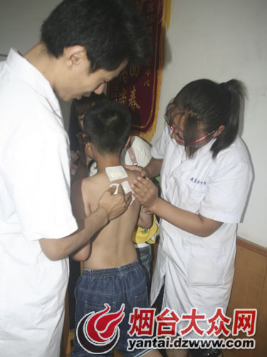 蓬莱市中医院医务人员正在为市民贴敷