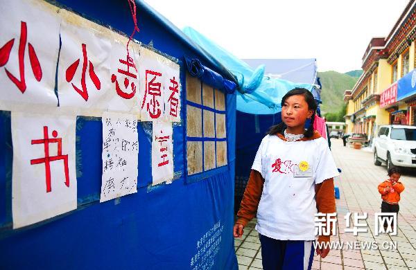 14岁的回族小姑娘马晓雪是青海玉树藏族自治州民族中学初二年级的学生。玉树地震发生后,马晓雪受到来自全国各地的抗震救灾志愿者的感染,成为一名光荣的小志愿者。半个月前,刚放暑假的马晓雪看见一群小朋友在放学后打打闹闹,无事可做,于是产生了建一个小书屋的想法。这个想法立刻得到了来自山东的志愿者宋玉明和华夏公益联合会志愿者徐朗的支持。很快,在大家的捐助下,一个小小志愿者书屋在玉树县结古镇格萨尔广场上诞生了。马晓雪对记者说:“我看着小朋友们来这里读书感到很幸福,因为帮助别人是一件快乐的事情。”