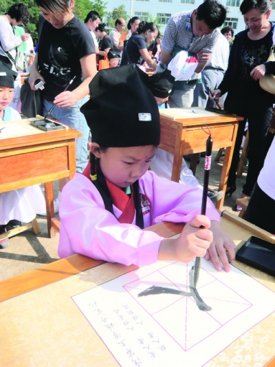 当日上午,记者在该校听到,孩子们口中念出的不是别的,正是中国国学的精髓之句:“学而时习之,不亦说乎?有朋自远方来,不亦乐乎?人不知而不愠,不亦君子乎?”“温故而知新,可以为师矣。”“学而不思则罔,思而不学则殆”……只见一个个一年级的学生认真朗诵着这些名句,有的学生高昂着头,有些学生挺拔站立,以自己独有的方式感悟着成长第一课。在他们面前整齐的摆放着一方砚台、一支毛笔、一张“人”字描红字帖,迎接他们的是一个特殊的仪式——古老而传统的“开笔礼”。