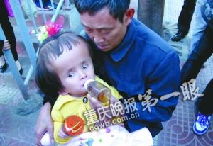记者在南坪步行街看到,被爷爷抱在怀里的小陈郑,脑袋非常突出,与她小小的身子很不协调。她身高不到1.1米,比同龄小孩矮很多,因长期瘫痪,部分手、脚萎缩,小手像鸡爪子般卷曲着。