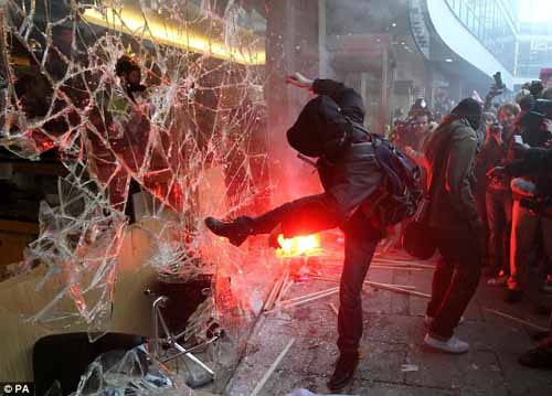 在游行队伍经过保守党所在的一座高层大楼时,一些示威者打碎大楼玻璃,在大楼外将一幅招贴点燃。