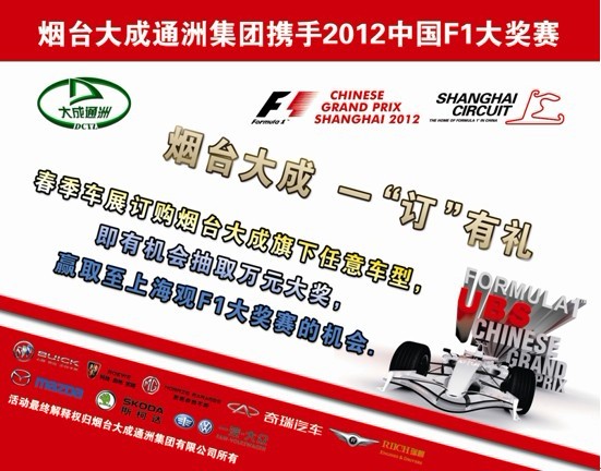 您想拥有一部专为自己量身定制的爱车吗?想现场观看精彩的F1赛事并得到丰厚的大奖吗?烟台大成通洲集团期待各位“准车主”前来选购属于自己的爱车,领取大奖。