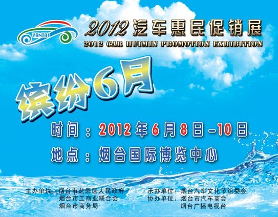 大众网烟台5月21日讯 (通讯员 王李丽 记者 张雪松) 记者获悉,由烟台市芝罘区人民政府、烟台市工商业联合会、烟台市商务局主办,烟台汽车文化节组委会承办,烟台市汽车商会、烟台广播电视台协办的“2012‘缤纷6月’汽车惠民促销展”将于6月8日至10日在烟台国际博览中心举行。