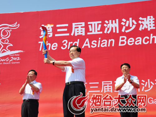 大众网烟台6月13日讯 (记者 胡昌辉 实习生 高崇德 刘慧慧) 今天上午,第三届亚洲沙滩运动会火炬传递在烟台海边沙滩举行。全程共设22个火炬手交接点,45名火炬手代表着亚洲45个国家和地区,共同完成了约1.2公里的火炬传递,烟台籍奥运冠军邢傲伟担任第一棒火炬手。