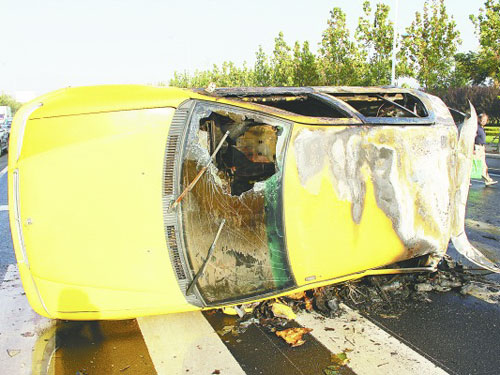 据了解,吉利车在被撞发生侧翻后,尾部便冒起了烟,不久轿车尾部就起火了,幸好当时车主很快从里面跳了出来才捡回了一条命。“当时没注意汽车尾部起火,只是觉得感到很热,回头一看才发现起火了。”杜先生告诉记者,“看到起火,自己心里也有些慌了,就赶快解开安全带出去。”说起当时的经历,杜先生表示现在依旧感觉有些后怕。“当时自己解开安全带以后,就赶忙打开副驾驶的车门跳了出来,现在自己也想不起当时到底是怎么跳出来的。副驾驶座下有灭火器,但当时什么也顾不上了。”在杜先生从车内出来不久,火势就越来越大,最后整辆车也都起火了。
