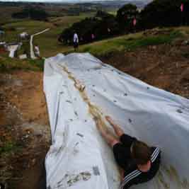 ▲虽然只有两把铲子和一台挖掘机,但新西兰的两男子却发誓要在一个月内挖掘出世界最长的滑水坡道。图:这条650米长的滑水坡道即将开放。世界上目前最长的滑水坡道是奥地利的黑洞,长211米。(国际在线)