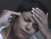 ▲头部按摩。以中指指腹自下而上交替按摩印堂穴30次,再沿眉按摩眉棱骨,太阳穴各30次。