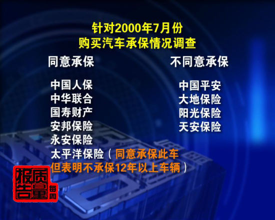 事实真的如此吗?记者在江苏对2011年我国财产险公司中,业务收入排名前十位的保险公司进行了调查。结果,针对这辆2000年7月购买的小汽车,五家保险公司同意对承保车损险,其中包括中国人保,中华联合,国寿财产,安邦保险和永安保险。太平洋保险表示可对此车承保,但不承保车龄在12年以上的车辆。其余四家保险公司不同意承保,包括中国平安,大地保险,阳光保险和天安保险。
