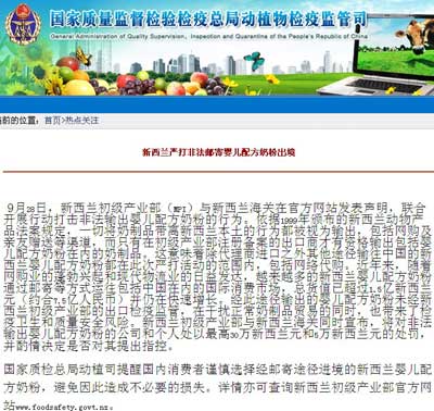 国家质检总局动植司提醒国内消费者谨慎选择经邮寄途径进境的新西兰婴儿配方奶粉,避免因此造成不必要的损失。