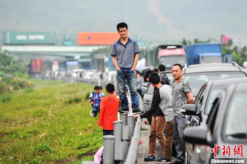 4月3日,深汕高速广东海丰县鲘门镇至陆丰县一段因交通事故和车流密集等原因造成长达数十公里的拥堵,高速公路俨然“变身”停车场。不少车主停车占用应急车道。图为汽车乘客下车休息。洪坚鹏 摄