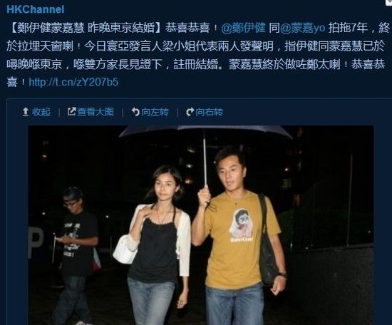 郑伊健蒙嘉慧东京注册完婚