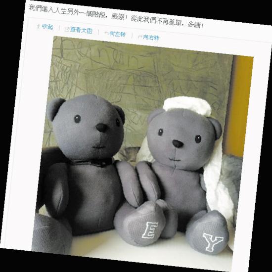 郑伊健在微博除了承认婚讯,还贴了一张熊公仔图片