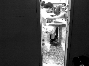 昨日下午,一名考生在闭卷考试时,将“小抄”垫在腿上抄袭。记者发现,该考场很多考生都有作弊行为。