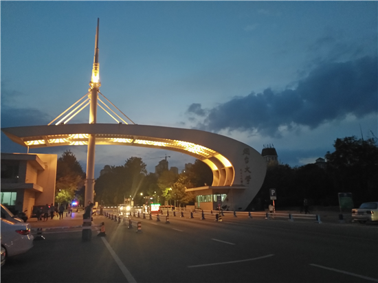 3.这是校园东门的一副傍晚图,天空和灯光相交错,别有一番风味