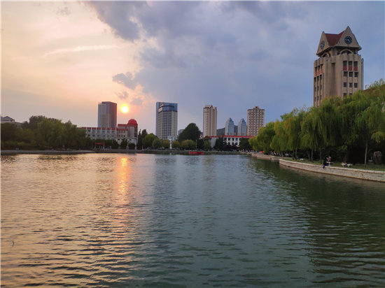 在三元湖畔拍摄的夕阳,夕阳还未真正落下,落日的余晖洒在湖面上。一半天空被夕阳照亮,另一半天空似已被浓云遮挡,就快天黑了,夕阳发着它最后的光亮,但它另一半的光亮似又被云抹去了,带给我一半天明一半黑的夕阳画面。